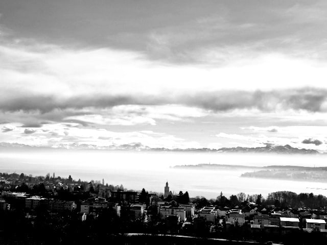 Alles Mögliche regt mich zum Schreiben an. Immer wieder auch der Blick aus dem Fenster. Normalerweise ist er farbig – und ich finde, in Schwarz-Weiß hat er ebenfalls was.
