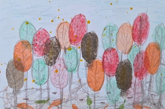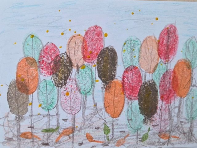 Wir haben mit den Fingern den Wald gestempelt und dazu eine Geschichte geschrieben.