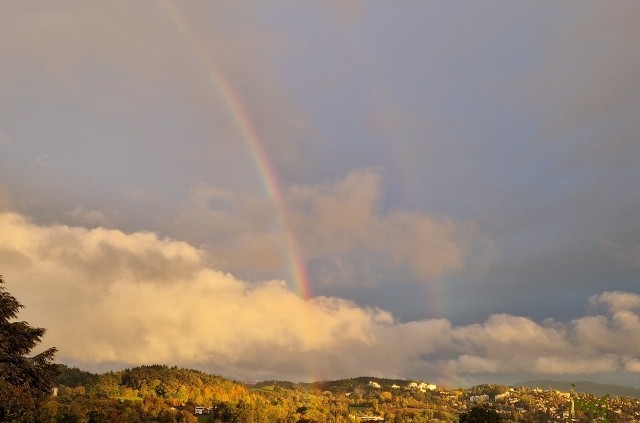 rotglühende, gelb und braungrün beblätterte Bäume,