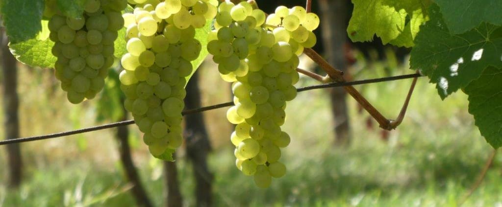 Die hellen Trauben funkeln durchscheinend in der Sonne.