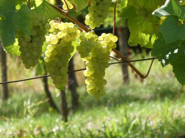 Die hellen Trauben funkeln durchscheinend in der Sonne.