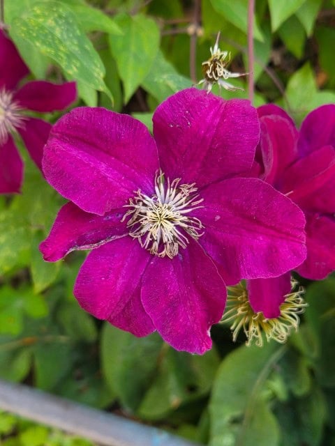 Pink-lila die Clematis Blüte. Helle Staubgefäße in der Mitte. Eine Biene lässt sich einladen, tut sich gütlich.